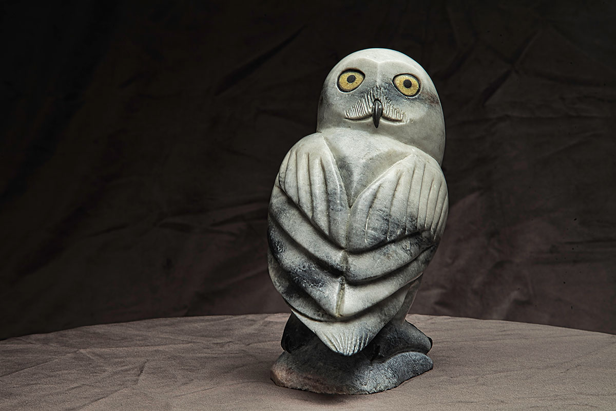 Materials: of Arctic Bay marble – eyes are black and yellowish African wonderstone – talons and beak are black African wonderstone